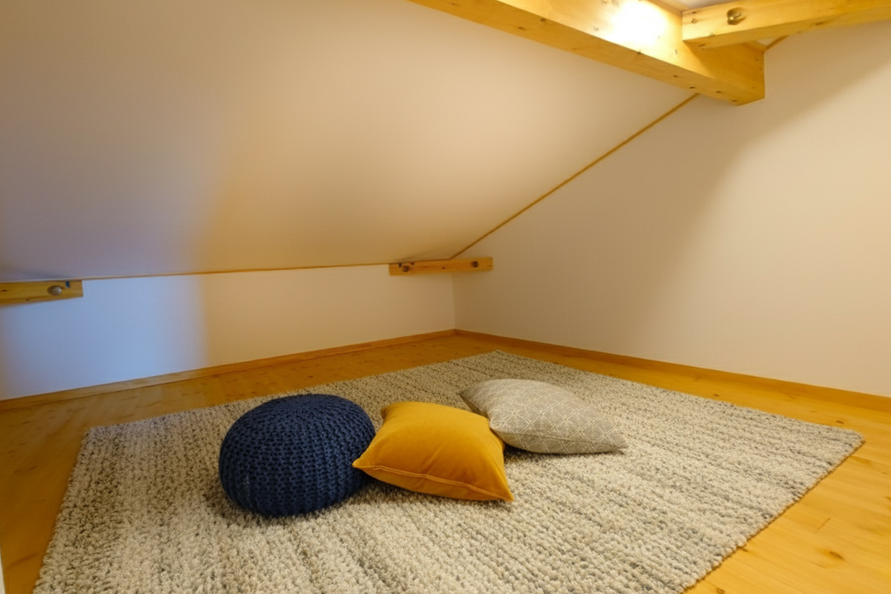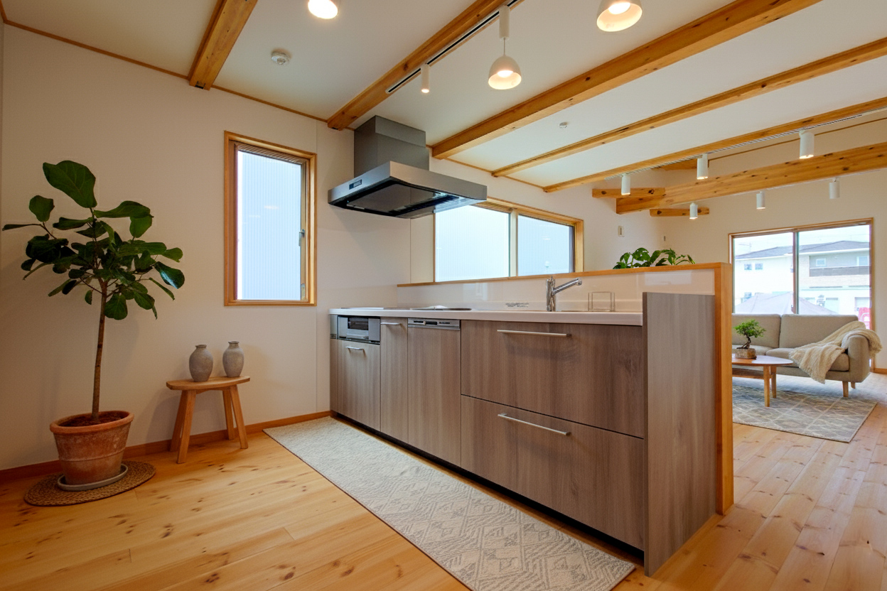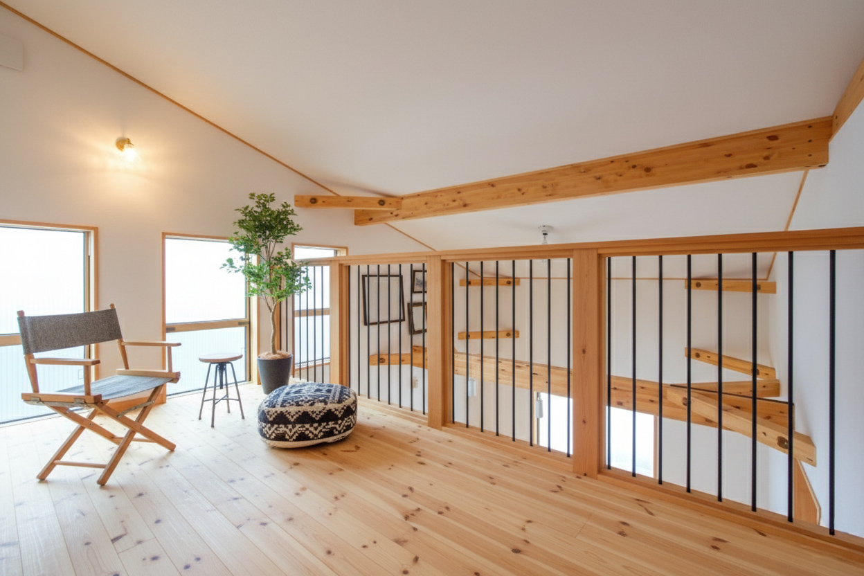 内観をナチュラル色でコーディネート。 建物全体が優しい雰囲気に包まれるようにこだわりました。ワクワク感を掻き立てる小屋裏は収納としても使えます。
